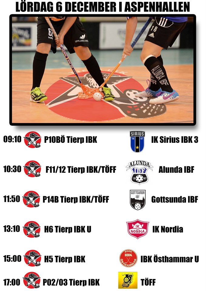 Fredag 5/12 19.30 F10/11 Västerlöfsta IBF - Tierp IBK/TÖFF Lördag 6/12 09.10 P10BÖ Tierp IBK - IK Sirius IBK 3 10.30 F11/12 Tierp IBK/TÖFF - Alunda IBF 11.50 P14B Tierp IBK/TÖFF - Gottsunda IBF 2 - 3 13.10 H6 Tierp IBK U - IK Nordia 5 - 11 15.00 H5 Tierp IBK - IBK Östhammar U 17 - 4 17.00 P12 Tierp IBK - TÖFF (Träningsmatch) 3 - 7 19-00 D4V Björklinge BK - Tierp IBK/TÖFF 2 - 1 (1-0, 0-1, 1-0) En bra match spelad av tjejerna. Hade otur med bollen som inte ville hitta sig in i Björklinges mål. Vi har tre powerplay som såg bra ut, dock inga mål. Vi har två boxplay och nollar Björklinge. Bra jobbat alla lagen! Foto: Tierp iDag Tierp IBK 8 dec 2014 0kommentarer